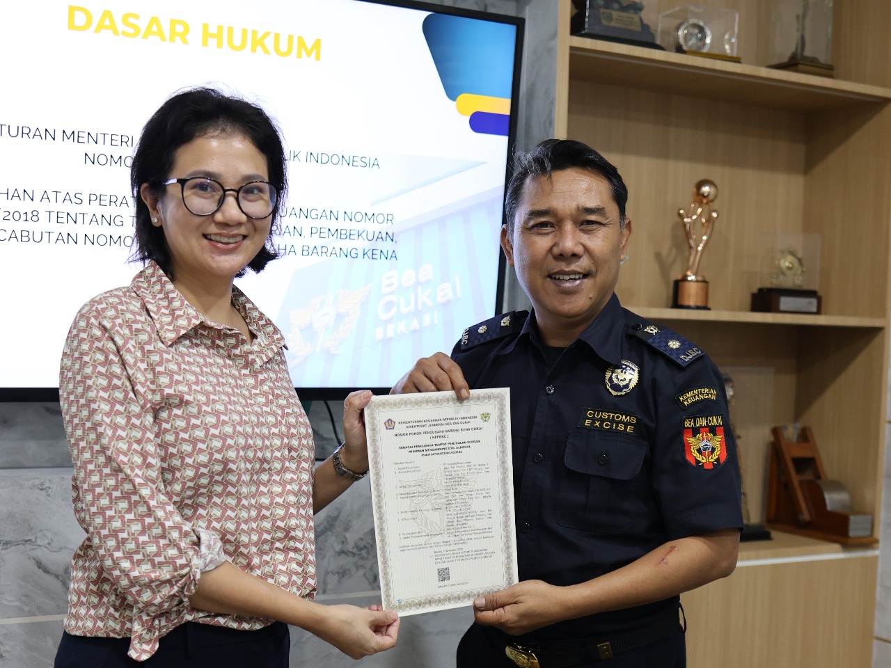 Bekasi, 18-11-2025 – Bea Cukai Bekasi terbitkan izin nomor pokok pengusaha barang kena cukai (NPPBKC) kepada PT Amartha Boga Lestari. Penyerahan izin dilakukan secara simbolis oleh Kepala Seksi Pelayanan Kepabeanan dan Cukai V, Yuwono Sustiasmaji, bersama Kepala Seksi Penyuluhan dan Layanan Informasi, Undani, bertempat di Kantor Bea Cukai Bekasi, pada Senin (10/11).